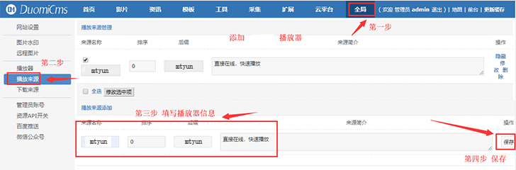 请按以下步骤进行:依次点击【视频】-【播放器设置】,然后在【添加播放器来源】依次输入